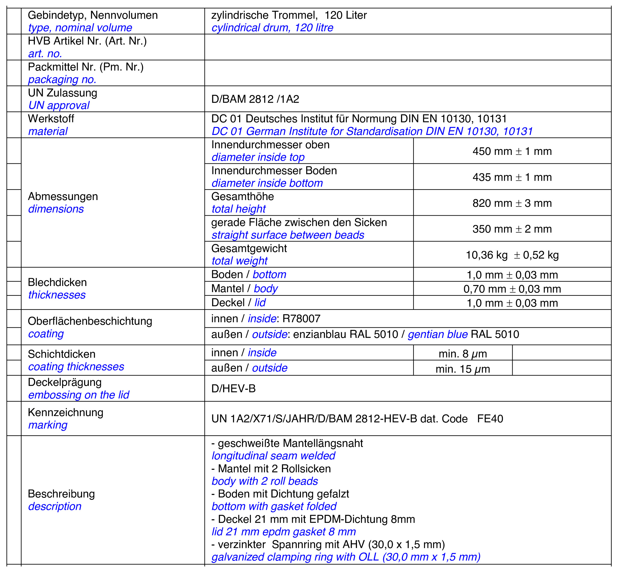 Vlastnosti: Dlouhý švu svařované, Podlahové složené a uzavřené, pozinkovaný upínací kroužek s vnějším uzávěrem páky, zbývající prázdný